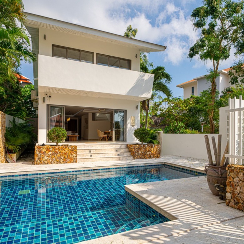 Discover paradise in this luxurious 4-bedroom, 5-bathroom seaview villa nestled in an elite gated community just minutes from Chaweng Beach, Koh Samui. Spanning three levels, Samui Sunrise Villa offers breathtaking panoramic sea and mountain views, seamlessly blending tropical elegance with premium European standards.