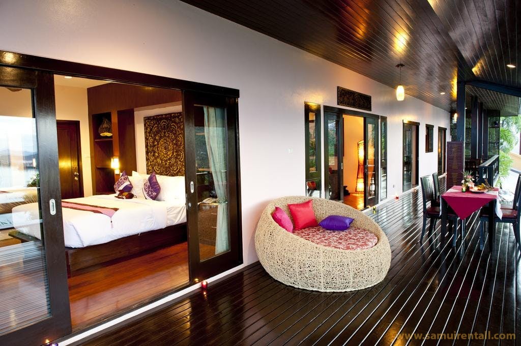 The Pool Villa is most secluded accommodation and features all of the benefits of indoor/outdoor living. Imagine yourself sipping champagne on your terrace, and enjoying one of the finest views on Koh Samui. The 40 sq. meter infinity pool is adjacent to a deck that includes a Jacuzzi tub, an outdoor shower and five poolside lounge chairs. Also connected to this pool area is a large covered outdoor balcony furnished with a breakfast table, a dining table with seating for six, a wicker swing, and a wicker loveseat.