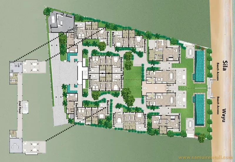 Welcome to one of Koh Samui’s most exclusive beachfront estates! Nestled on a serene 42-meter stretch of Maenam Beach, the Sila & Wayu Residences are luxurious Thai-style villas offering interconnected living for up to 28 guests—perfect for weddings, family reunions, wellness retreats, or corporate events.