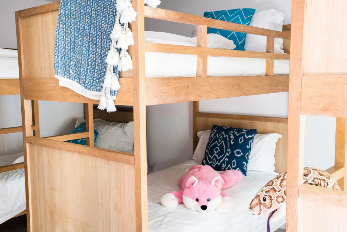 • Kids’ rooms with bunk beds, shared games room, gym, sauna, and conference room